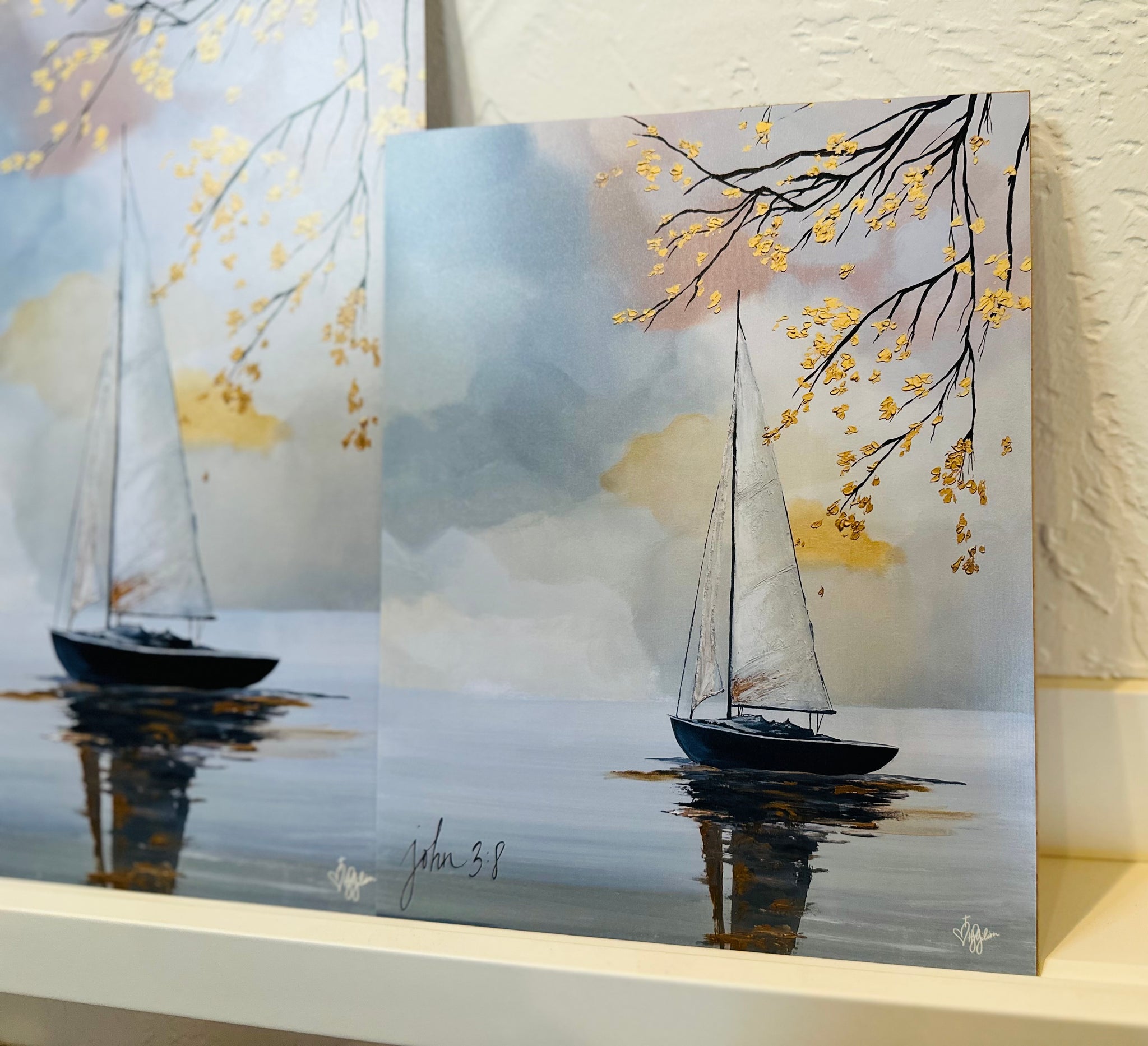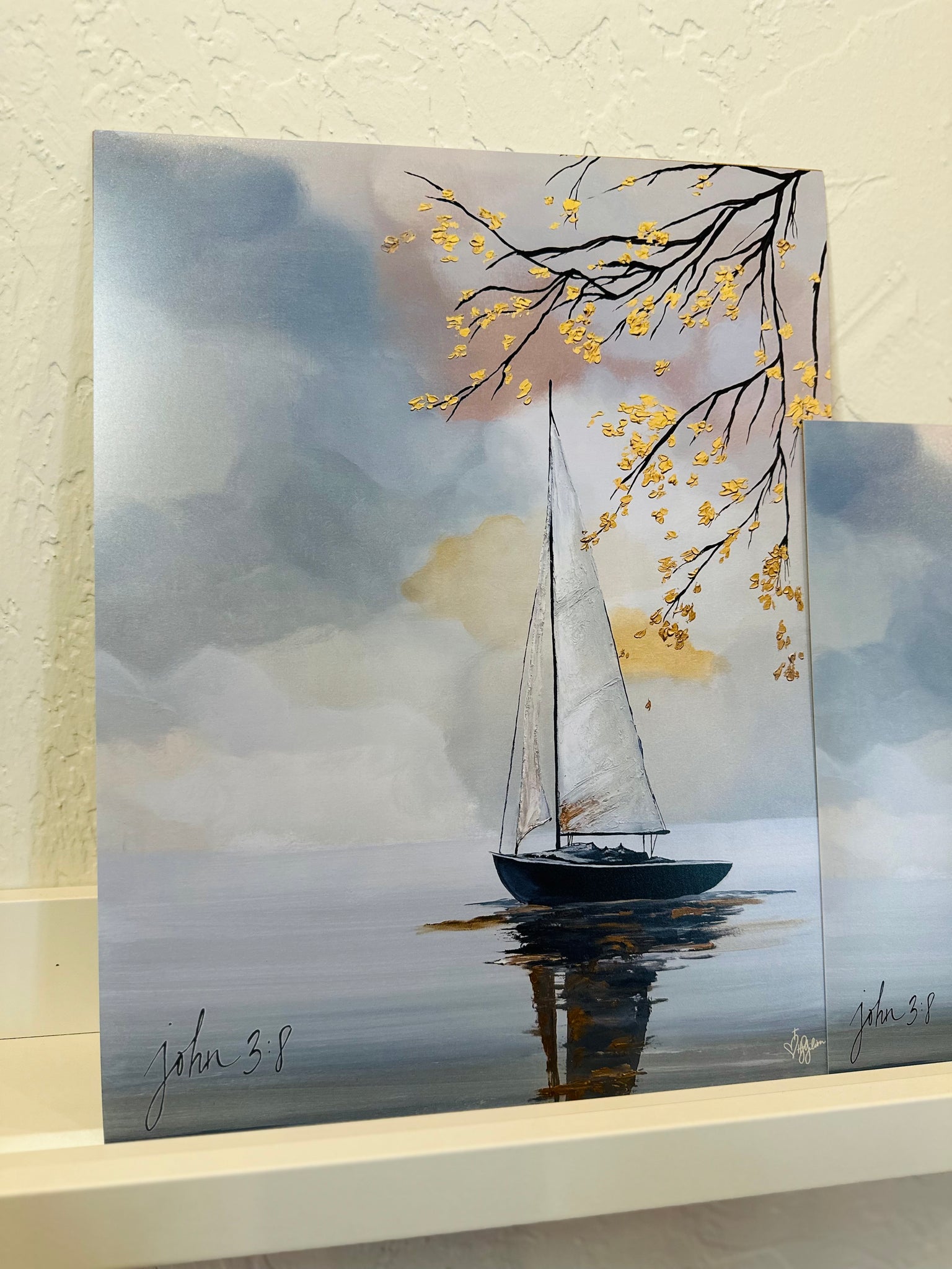 What I was longing to capture in this painting was a reminder of our relationship with God. We may feel sufficient and able on our own, but in reality we are just motionless sailboats. To move we need something we can't make on our own. We need something we can't even see... we need the WIND.